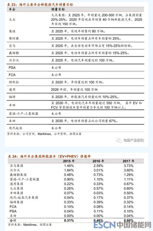 2025年海外車企新能源車當年銷量預計達1400萬輛以上。2012-2017年,海外12大車企集團(不包含特斯拉)所有整車銷量CAGR約2.6%。假設該復合增速為2017-2025年的增速,對應2025年銷量為9365萬輛。我們分別假設2025年12大車企集團新能源汽車(EV+PHEV)滲透率為10%、15%、20%、25%,分別對應936、1405、1873、2341萬輛的當年銷量。中性預測2025年海外12大車企的新能源汽車銷量有望達到1400-1900萬輛。