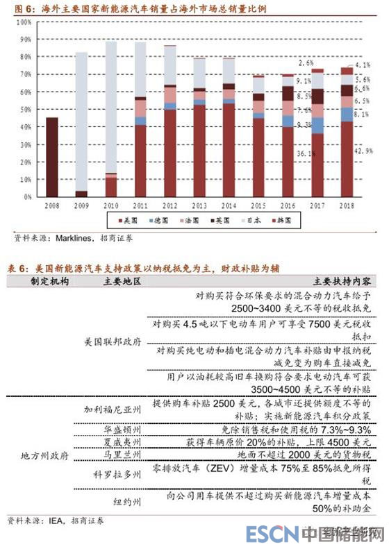 美國是海外新能源汽車銷量最大的單一國家。2018年,美國新能源汽車銷售35.1萬輛,增長79.6%,占海外新能源汽車市場比例達到42.9%,較2017年提升6.8個百分點,連續(xù)多年為海外新能源汽車銷量最大的單一國家。美國從80年代開始著手新能源汽車的研發(fā),近幾屆政府重視程度也比較高,構建了以納稅減免為主、購車補貼為輔的產(chǎn)業(yè)支持政策;美國國內(nèi)也出現(xiàn)了特斯拉為代表的創(chuàng)新企業(yè)。