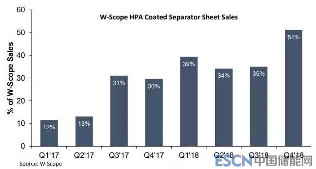W-Scope在2018年第四季度報告中顯示,作為總銷售額的比例,HPA涂層隔板的銷售比例躍升至51%,而前四個季度的平均銷售量約為34%。W-Scope兩年前宣布,而對于2020年,W-Scope預測預期銷售收入將進一步增加,比2019年的高出50%,主要是因為另外四條HPA涂層隔膜生產(chǎn)線的資本支出,以應對相關(guān)的涂層隔膜供應合同與電動汽車行業(yè)。