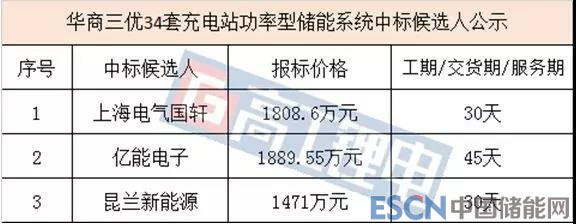 中國儲能網(wǎng)訊:日前,北京華商三優(yōu)新能源科技公司(下稱“華商三優(yōu)”)發(fā)布34套充電站功率型儲能系統(tǒng)中標候選人公示,前三企業(yè)分別為上海電氣國軒、億能電子、昆蘭新能源;各家報價是:1808.6萬元、1859.55萬元和1471萬元。(詳見下圖)