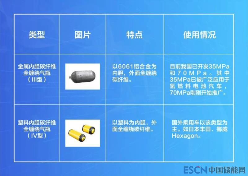 其中,儲氫瓶相當于傳統(tǒng)燃油車的油箱,其儲氫量有如油箱儲油量。目前,國內(nèi)外主流儲氫瓶為高壓氣態(tài)瓶,國內(nèi)使用Ⅲ型瓶(金屬內(nèi)膽碳纖維全纏繞氣瓶),國外使用Ⅳ型瓶(塑料內(nèi)膽碳纖維全纏繞氣瓶)。
