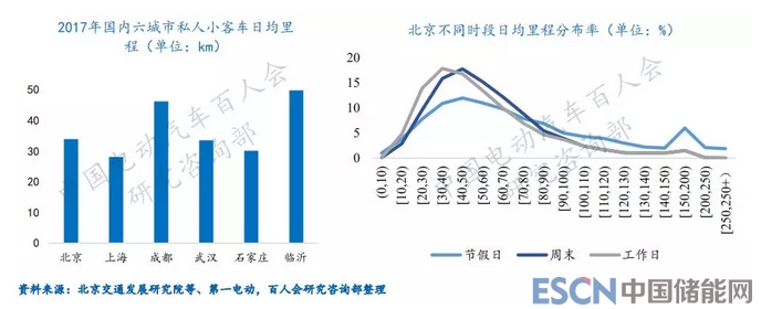 在城市出行中,大部分居民主要以上班及日常通行為主,日行駛里程較短,根據(jù)北京交通發(fā)展研究院研究數(shù)據(jù)顯示,典型城市日均行駛里程在50公里以?xún)?nèi)。而從北京出行特點(diǎn)來(lái)看,在普通工作日,日行駛里程低于200公里的占比為99.97%,在法定節(jié)假日,90.1%的車(chē)輛行駛在150公里以下。按照電動(dòng)汽車(chē)?yán)m(xù)駛里程300公里為基準(zhǔn),考慮夏季與冬季的溫度變化,假設(shè)里程波動(dòng)為30%,綜合續(xù)航能力約為210公里,仍可以滿(mǎn)足絕大部分出行需求。