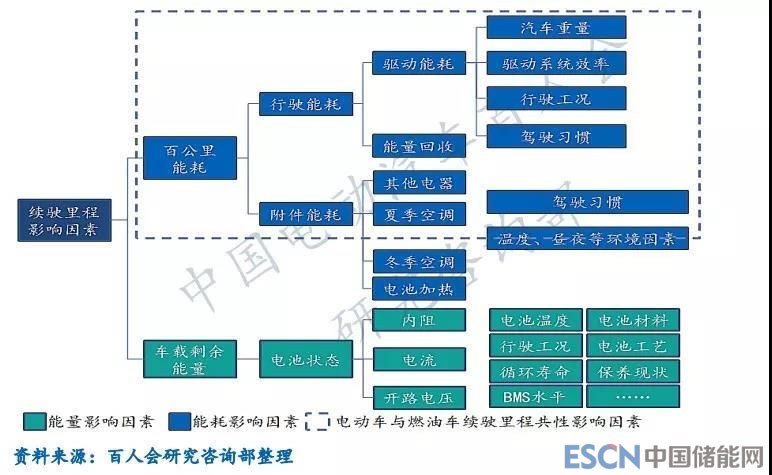 電動(dòng)汽車(chē)的續(xù)駛里程受多重因素影響,包括能量因素和能耗因素:一是車(chē)載剩余能量,電動(dòng)汽車(chē)的車(chē)載剩余能量主要與電池當(dāng)前狀態(tài)有關(guān);二是能耗,包括驅(qū)動(dòng)用能耗和車(chē)載附件用能耗等。綜合而言,電動(dòng)汽車(chē)?yán)m(xù)駛里程除了與傳統(tǒng)燃油車(chē)一樣受到汽車(chē)重量、驅(qū)動(dòng)系統(tǒng)效率、行駛工況、駕駛習(xí)慣、部分環(huán)境因素等多方面共性能耗因素影響外,由于動(dòng)力電池自身化學(xué)特性,又對(duì)溫度因素更加敏感,同時(shí)還受到電池材料、電池工藝、電池循環(huán)壽命與保養(yǎng)現(xiàn)狀等多方面對(duì)動(dòng)力電池本身能量因素影響。