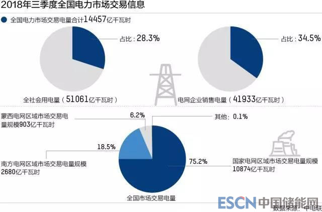 根據(jù)中電聯(lián)發(fā)布的統(tǒng)計(jì)數(shù)據(jù),2018年前9個(gè)月,全國(guó)電力市場(chǎng)交易電量合計(jì)為14457億千瓦時(shí),是2015年一整年的一倍還多,市場(chǎng)交易電量占全社會(huì)用電量比重近三成,占電網(wǎng)企業(yè)銷(xiāo)售電量比重的三成還多。其中,國(guó)家電網(wǎng)區(qū)域市場(chǎng)交易電量規(guī)模10874億千瓦時(shí),占全國(guó)市場(chǎng)交易電量的75.2%。