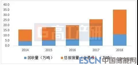 2014-2018年廢舊電池回收量及總報廢量(單位:萬噸)