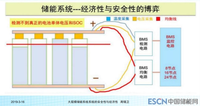 創(chuàng)新技術,這一塊是非常重要的,目前講儲能系統(tǒng)里面實際上全球都是一樣,在大規(guī)模儲存里面沒有太多的創(chuàng)新技術,都是其他技術移過來,比如說電動汽車的儲能管理技術?,F(xiàn)在國內的BMS大部分采用的都是汽車BMS里面的專用芯片,所以成本比較高。在高成本情況下,怎么樣能夠配合在儲能里,把幾顆電芯并起來,并起來成本越低,檢測一個點芯片的成本固定了,你的電芯多的并在一起就會減低整體成本,但是帶來一個致命的危害,幾顆并在一起,這個電位,大家都學過電路最基本的原理,并聯(lián)的電路測出來的電位是一樣的,所以并有一顆偏低或者有一顆偏高,你測不到這一顆,也就違反了BMS保護電芯能測到每一顆最壞的電芯。在這種情況下采取保護測試,這個初衷就不對,這個情況下經濟性嚴重影響了儲能系統(tǒng)的壽命。