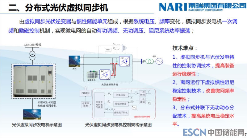 下面講自同步電壓源逆變器,剛才用光伏逆變器,這個(gè)主要用在儲(chǔ)能上面,由電壓源逆變器與大容量儲(chǔ)能單元組成,是微電網(wǎng)離網(wǎng)運(yùn)行時(shí)的組網(wǎng)主電源。離網(wǎng)時(shí)支撐微電網(wǎng)電壓、頻率穩(wěn)定;實(shí)現(xiàn)微電網(wǎng)的并離網(wǎng)切換等功能。下面幾個(gè)難題我們會(huì)分別介紹一下,就是說它實(shí)現(xiàn)了這些功能。