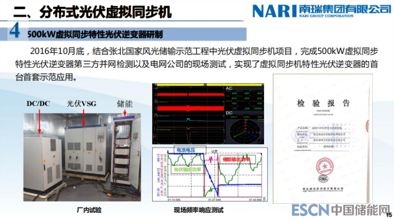 這是現(xiàn)場的應(yīng)用圖,這個(gè)是張北國家風(fēng)光儲(chǔ)光伏虛擬同步機(jī),實(shí)現(xiàn)了500千瓦的虛擬同步機(jī)光伏逆變器的第三方檢測以及現(xiàn)場測試,實(shí)現(xiàn)了它的首臺(tái)首套示范應(yīng)用。