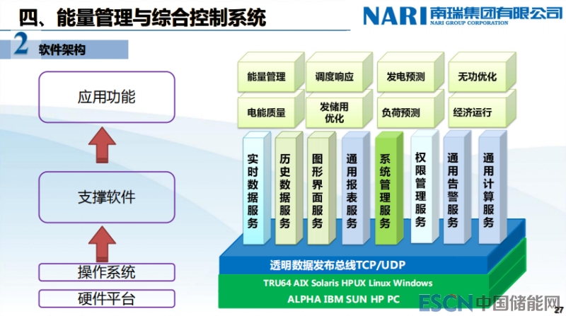 從功能上來說,底下是硬件平臺(tái),中間是操作系統(tǒng),然后是操作系統(tǒng)上的支撐應(yīng)用軟件,后臺(tái)是高級應(yīng)用。這里面是高級應(yīng)用的主要功能,第一是發(fā)電和用電的預(yù)測;第二是黑啟動(dòng)控制;第三實(shí)現(xiàn)了并離網(wǎng)的切換。同步電壓源在實(shí)現(xiàn)并離網(wǎng)切換過程中,能夠?qū)崿F(xiàn)頻率穩(wěn)定平滑的自動(dòng)控制功能。下面離網(wǎng)的能量調(diào)動(dòng)和自動(dòng)電壓的控制,以及調(diào)度交換功率控制,分布電源平滑出力控制,調(diào)度交換功率緊急控制,還有配網(wǎng)聯(lián)合調(diào)度。