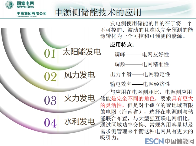 電源側(cè)儲(chǔ)能技術(shù)的應(yīng)用,電源側(cè)從國(guó)內(nèi)區(qū)域分西北、東北地區(qū)是太陽(yáng)能風(fēng)力發(fā)電,華中地區(qū)最多是火力發(fā)電,華東更多是水利發(fā)電。電源側(cè)應(yīng)用儲(chǔ)能的目的,在于不可控的、波動(dòng)的且難以完全預(yù)測(cè)的能源轉(zhuǎn)化為一個(gè)可控和可預(yù)測(cè)的能源。調(diào)峰-電網(wǎng)友好性,調(diào)頻-電網(wǎng)精準(zhǔn)性,出力平滑-電網(wǎng)穩(wěn)定性,輸電效率-電網(wǎng)經(jīng)濟(jì)性。與應(yīng)用在電網(wǎng)側(cè)相比,電源側(cè)應(yīng)用儲(chǔ)能是完全不同的角色,要求具有更大的靈活性,但是對(duì)于孤立的或者區(qū)域有限的電網(wǎng),海南省這些都是獨(dú)立電網(wǎng),選擇在電源側(cè)與儲(chǔ)能聯(lián)合布置,與大型強(qiáng)互聯(lián)電網(wǎng)相比,通過(guò)區(qū)域功率交換、常規(guī)備用容量以及需求側(cè)管理來(lái)平衡這種電網(wǎng)具有更大的吸引力。