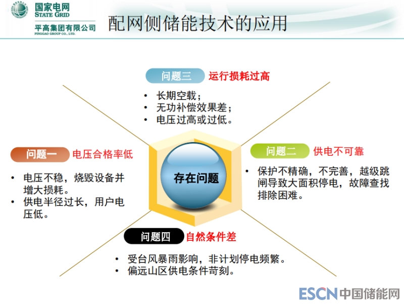 配網(wǎng)側(cè)儲(chǔ)能技術(shù)的應(yīng)用。一是配網(wǎng)末端,從能量守恒來(lái)說(shuō),發(fā)的電不管是火力、水利,無(wú)非就是通過(guò)輸電要配出去,現(xiàn)在國(guó)內(nèi)每年花大量的資金進(jìn)行配網(wǎng)改造,一是跟經(jīng)濟(jì)有關(guān),二是配網(wǎng)的利用率比較低。一個(gè)就是電網(wǎng)合格率低,第二個(gè)供電不可靠,第三運(yùn)行損耗過(guò)高,第四自然條件差。