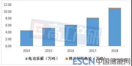 2014-2018年中國鋰電池拆解與梯次利用規(guī)模(單位:萬噸)