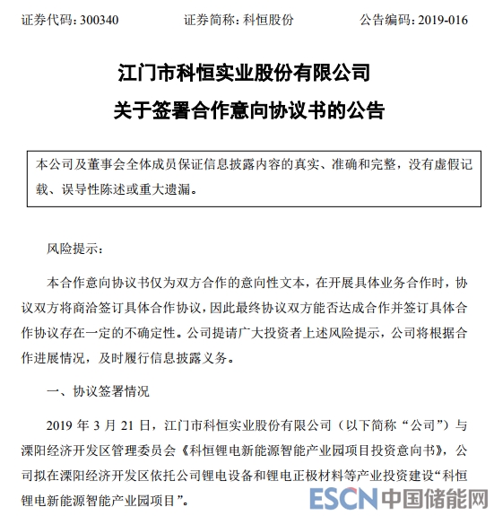 中國(guó)儲(chǔ)能網(wǎng)訊:科恒股份3月21日發(fā)布公告稱(chēng),2019年3月21日,江門(mén)市科恒實(shí)業(yè)股份有限公司與溧陽(yáng)經(jīng)濟(jì)開(kāi)發(fā)區(qū)管理委員會(huì)簽署《科恒鋰電新能源智能產(chǎn)業(yè)園項(xiàng)目投資意向書(shū)》,擬在溧陽(yáng)經(jīng)濟(jì)開(kāi)發(fā)區(qū)投資人民幣30億元,依托公司鋰電設(shè)備和鋰電正極材料等產(chǎn)業(yè)投資建設(shè)“科恒鋰電新能源智能產(chǎn)業(yè)園項(xiàng)目”。