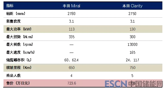 豐田和本田燃料電池汽車關(guān)鍵參數(shù)比較