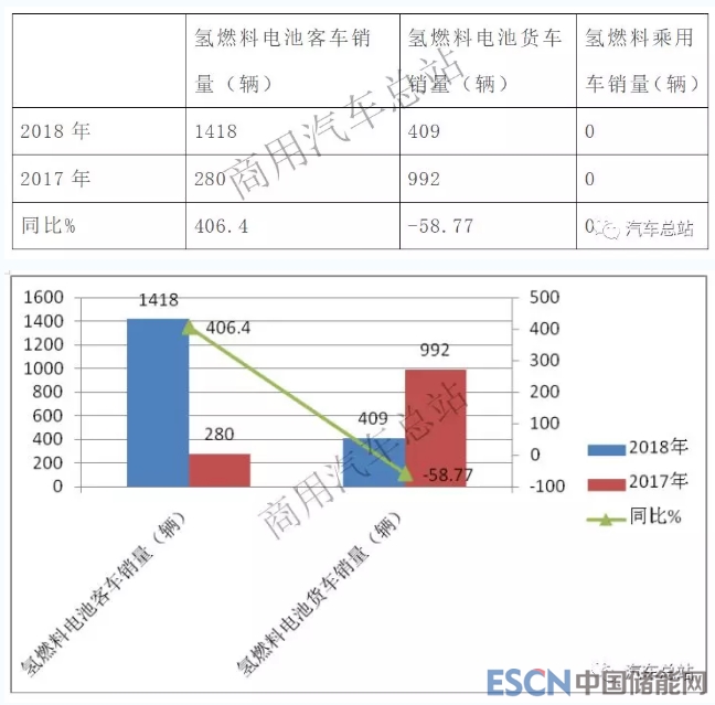 2、根據(jù)中汽協(xié)數(shù)據(jù),2018年氫燃料電池汽車累計銷售1527輛,其中燃料電池客車銷售1418輛,同比增長406.4%。