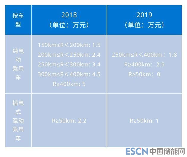而續(xù)航里程大于等于400km的純電動(dòng)乘用車,2018年可享受補(bǔ)貼5萬(wàn)元,2019年補(bǔ)貼新政調(diào)整為2.5萬(wàn)元,補(bǔ)貼退坡50%。