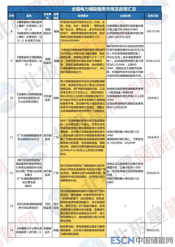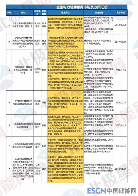 2017年國(guó)家能源局將東北、山西、福建、山東、新疆、寧夏、廣東、甘肅等8個(gè)地點(diǎn)作為第一批電力輔助服務(wù)市場(chǎng)試點(diǎn),2018年多省陸續(xù)又發(fā)布了電力輔助服務(wù)市場(chǎng)開啟運(yùn)營(yíng)規(guī)則,儲(chǔ)能可參與的電力輔助服務(wù)市場(chǎng)范圍進(jìn)一步擴(kuò)大。