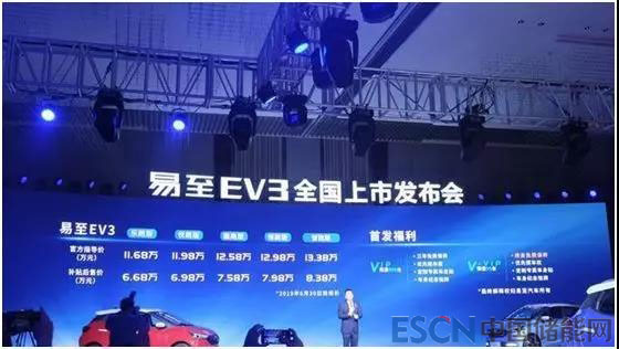 3月26日,江鈴新能源旗下易至品牌全新純電動車——易至EV3上市推出高、低功率兩種動力版本共5種配置車型,綜合續(xù)航分為251公里和301公里兩種版本,補貼后售價6.68-8.38萬元。好巧不巧,時間剛好趕在2019年補貼新政當(dāng)天。