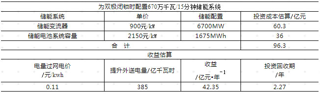 在PSASP仿真平臺(tái)中搭建河南電網(wǎng)算例,模擬天中直流在輸送800萬(wàn)千瓦功率時(shí)發(fā)生最?lèi)毫拥碾p極閉鎖故障時(shí),探索儲(chǔ)能在系統(tǒng)穩(wěn)定過(guò)程中的效果及所需儲(chǔ)能容量的大?。煌瑫r(shí),以天中直流輸送通道為載體,分析在受端河南電網(wǎng)布局一定容量的儲(chǔ)能系統(tǒng)作為送端新疆電網(wǎng)的跨區(qū)備用容量源,對(duì)新能源發(fā)電占比提升的促進(jìn)程度。得出投入670萬(wàn)千瓦/15min儲(chǔ)能系統(tǒng),可提高長(zhǎng)南線與天中直流770萬(wàn)千瓦的穩(wěn)定送功率,提升385億千瓦時(shí)的外送電量,設(shè)定一年內(nèi)的通道利用小時(shí)數(shù)約為5000h,計(jì)算結(jié)果如表1所示,項(xiàng)目的投資回收期約2.27年。