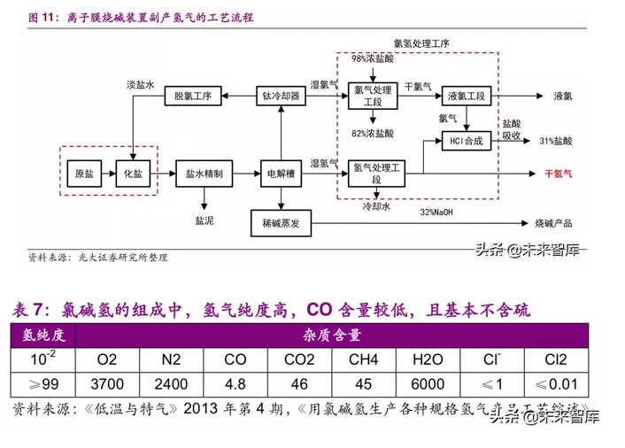 目前包括天然氣重整和煤氣化在內(nèi)的化石燃料制氫盡管適用于大規(guī)模工業(yè) 制氫,但是工藝復(fù)雜、投資較大且能耗較高;焦炭行業(yè)副產(chǎn)的焦?fàn)t氣中雖有大 量氫氣可供提純,但焦?fàn)t氣中氫氣含量(vol)僅有 55%,且伴生大量一氧化碳 和硫化物,因此氫氣提純和精制成本相對(duì)較高。而國(guó)內(nèi)氯堿行業(yè)目前基本上全 部采用離子膜電解路線,副產(chǎn)氫氣的純度一般在 99%以上,一氧化碳含量較低 且無化石燃料中的有機(jī)硫和無機(jī)硫,因此純化成本相對(duì)較低,目前氯堿廠用于 雙氧水生產(chǎn)、制藥、電子和石英加工的回收氫氣成本僅約1.3 元/Nm3。而從規(guī) 模上看,一套 40 萬噸/年的燒堿裝置每年除供下游鹽酸和 PVC 裝置用氫外,仍 可外供 0.3 萬噸氫氣。