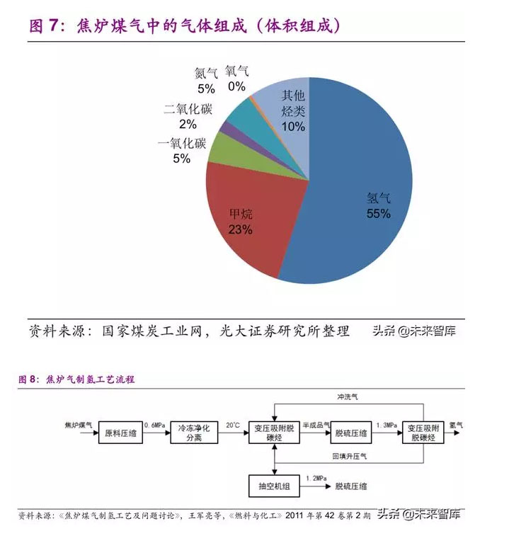 近年來由于環(huán)保要求趨嚴(yán),大部分焦炭裝置副產(chǎn)的焦?fàn)t煤氣下游都配套了 深加工裝置,用來作為合成氨、甲醇、LNG、合成氣制烯烴、合成氣制乙二醇 等裝置的原料。部分鋼廠配套建設(shè)的焦化廠,少數(shù)企業(yè)經(jīng)變壓吸附裝置提純氫 氣,作為冷軋廠等生產(chǎn)過程的保護(hù)氣或作為商品氣出售。除了上述應(yīng)用途徑之 外,仍有 50%左右的焦?fàn)t煤氣作為城市煤氣或企業(yè)自身燃料回爐助燃,因此理 論上全國(guó)焦化行業(yè)可以提供 325 萬噸副產(chǎn)氫氣用來滿足燃料電池需求。