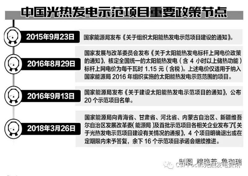 2016年9月,在國家能源局公布的首批光熱發(fā)電示范項目名單中,有20個項目在111個申請競爭中勝出,總裝機容量1.349吉瓦。據(jù)相關文件規(guī)定,在2018年底前并網(wǎng)的示范項目可以享受1.15元/千瓦時的上網(wǎng)電價。這些項目中,共有9個項目采用塔式發(fā)電技術,7個采用槽式發(fā)電技術,4個采用線性菲涅爾技術,所有項目都設計了大容量、多時長的儲熱系統(tǒng)。