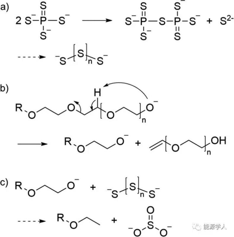 上圖中a)PS43-單位與P2S74-單位和多硫化物的反應;(b)PEO分子的內(nèi)部降解;(c)由(b)與(a)與亞硫酸鹽和聚合物碎片反應生成的多硫化物??傊?,LSPS的降解機制從PS43-單元開始,釋放出的硫可以與聚硫化物發(fā)生反應,聚硫化物也是聚氧化乙烯(PEO)吸收的鋰離子;同時,該聚合物可能發(fā)生分子內(nèi)裂解,通過PEO與LiOH的脫核作用加速了分解,然后,生成的醇氧化物可能與多硫化物反應形成亞硫酸鹽和其它低分子量的聚合物。
