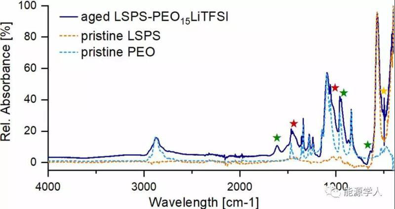 上圖為PEO15LiTFSI| LSPS樣品在60°C下老化7天后的FTIR對比,出現(xiàn)在1030 and 1420 cm?1的肩峰對應著S=O振動(由紅星標記),S–S多硫化物(以黃星為標志)的拉伸振動通常產(chǎn)生500 cm-1左右的弱峰。然而,由于LSP中S-P和S-Sn帶的重疊很強,都出現(xiàn)在400和570 cm?1左右,因此不可能明確確認多硫化物的產(chǎn)生。635、905和1615 cm?1(綠星)處的強峰與C=C-H拉伸振動值相匹配,這表明聚合物的還原伴隨著氫或水的釋放。