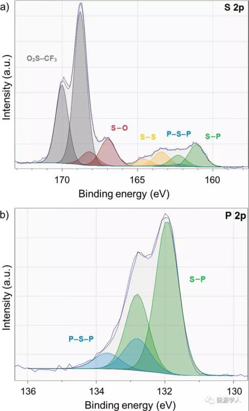 為了識別LSPS和PEO15LiTFSI之間的分解產(chǎn)物,作者對電池進行拆解,并對老化界面進行了研究。老化后界面的XRD圖與原來的LSPS和PEO15LiTFSI相同,表明反應產(chǎn)物是非晶態(tài)的或是組成很小的部分。相比之下,XPS分析顯示,在60°C時,s 2p和p 2p光譜發(fā)生了明顯變化。如上圖所示,作者首先關注了硫原子的化學環(huán)境,s 2p譜有五個雙峰模擬信號,168.9 eV處的S 2p3/2,即圖a中灰色區(qū)域標記的雙峰,表示LiTFSI中的[SO2-CF3];161.2 eV(綠色標記)處的信號對應于硫的最低氧化狀態(tài),源于LSPS的PS43?和SnS44?。P 2p的擬合需要考慮兩種結合態(tài),圖b中綠色區(qū)域標記的132.0 eV(p 2p3/2)為主信號,為與硫呈四面體配位的磷,即LSPS中的PS43?。132.9 eV(藍色標記)處的第二個信號可能來自P–[S]n–P,例如由P2S74?單元表示,相應的S 2p3/2信號出現(xiàn)在162.9 eV處。請注意,由于p 2p區(qū)域的信號強度較小,且雙峰重疊明顯,因此量化涉及高度不確定性。