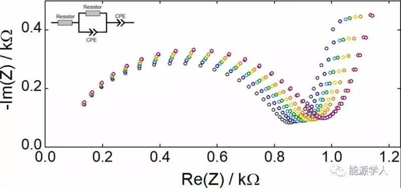 電池在首次加熱和冷卻循環(huán)時的阻抗譜(在每個溫度下保持約3小時)如上圖所示,在20°C時,接近29kΩ的初始高電阻是由電阻(iii)–(v)影響的。如同預期的一樣,電池在冷卻循環(huán)期間的EIS光譜顯示,電池的整體阻抗明顯低于加熱循環(huán)期間的電阻,這表明隨著溫度的降低,電池界面電阻降低。用于擬合實驗阻抗結果的等效電路如圖右上角所示,由于LSPS的體積和晶界電阻非常小,因此,它們很難被解析。電阻(iii)–(v)在Nyquist圖中顯示為半圓,因此由電阻和電容器的并聯(lián)電路建模。為了解釋固體-固體界面的非理想電容行為,如圖中半圓的凹陷所示,作者根據(jù)先前的文獻,使用恒相元件(CPE)代替理想電容器。SE層間的半無限擴散,在低頻區(qū)呈45°斜線,由Warburg擴散進行擬合。