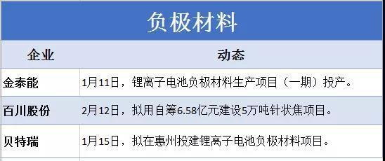 圖為2019年首季度國(guó)內(nèi)主要材料企業(yè)在負(fù)極材料方向的市場(chǎng)動(dòng)態(tài)