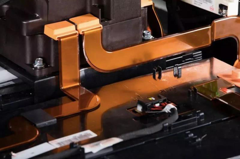 另外,高壓電器的連接也是整個電池包組裝中最核心最關鍵的一點,尤其是在主回路連接的可靠性和低內阻設計上。比亞迪的電池包在主回路的長距離連接上采用了耐高溫的聚酰亞胺壓封的銅排,并且設計了很多立體彎折,從而在受到振動,或是受熱膨脹時,通過這些彎折來吸收長度的變化,避免將載荷轉移到連接螺釘上。