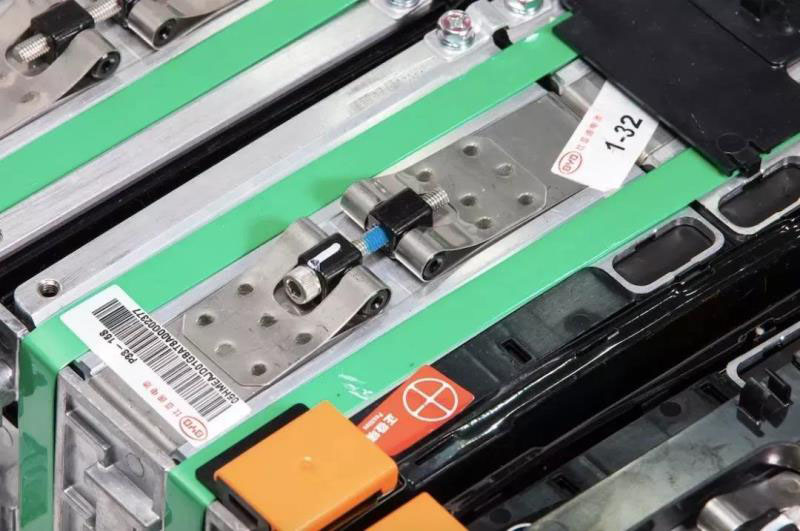 雖然從接觸內阻的角度來講,單螺釘?shù)慕佑|內阻就滿足發(fā)熱要求。但比亞迪依然堅持用雙螺釘?shù)脑O計方案,從而大幅提高可靠性。而且在螺釘?shù)臄Q緊確認上,我們發(fā)現(xiàn)有三種顏色的色標,這意味著進行了三遍確認。第一遍為自動擰緊軸擰緊,并打上紅色標記,后兩遍為人工利用扭矩扳手復檢,分別打上黃色和白色標記。