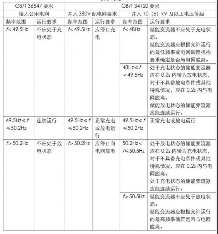 從上表可知,GB/T34120標(biāo)準(zhǔn)要求完全滿足GB/T36547的要求,GB/T36547僅規(guī)定了在電網(wǎng)頻率異常情況下儲(chǔ)能系統(tǒng)不應(yīng)處于的運(yùn)行狀態(tài),但并未講明若系統(tǒng)本身剛好在該運(yùn)行狀態(tài)應(yīng)該如何響應(yīng)以及響應(yīng)的時(shí)間要求等,故從執(zhí)行性的角度來(lái)看,GB/T 34120規(guī)定更嚴(yán)謹(jǐn)具備更高的可執(zhí)行性。