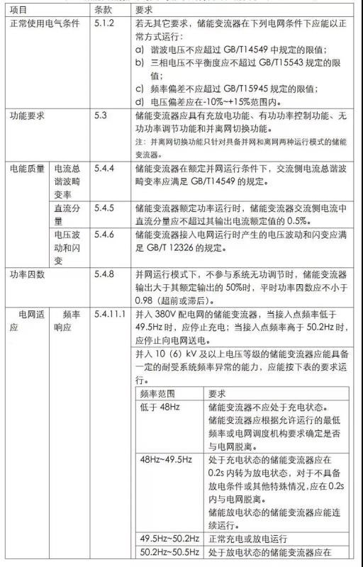 作為產(chǎn)品定型標(biāo)準(zhǔn),該標(biāo)準(zhǔn)涵蓋了儲(chǔ)能變流器的安全要求、性能和功能要求(包括并網(wǎng)兼容性要求)、環(huán)境適應(yīng)性要求、電磁兼容性要求等諸多方面的技術(shù)要求。下面僅對(duì)并網(wǎng)模式以及并離網(wǎng)運(yùn)行模式下的儲(chǔ)能變流器涉網(wǎng)部分的要求進(jìn)行分析。