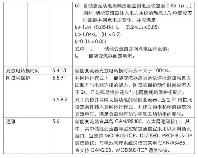 GB/T34120條款5.4.12.1對(duì)儲(chǔ)能變流器接入公用電力系統(tǒng)條件下電力系統(tǒng)發(fā)生故障時(shí)的低電壓穿越能力提出了要求,并在條款5.4.12.2中對(duì)于低電壓穿越過(guò)程中儲(chǔ)能變流器的動(dòng)態(tài)無(wú)功支撐能力提出了要求。