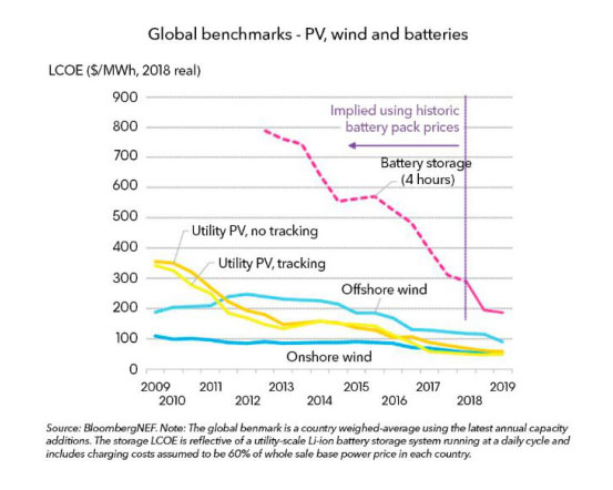 根據(jù)其對全球7000多個儲能項目的公共和專有數(shù)據(jù)進(jìn)行的分析,自2018年上半年以來,鋰離子電池的平準(zhǔn)化能源成本(LCOE)下降了35%,已降到每兆瓦時187美元。其下降的幅度超過了太陽能發(fā)電設(shè)施和陸上和海上風(fēng)力發(fā)電平準(zhǔn)化能源成本(LCOE)持續(xù)下降的幅度。
