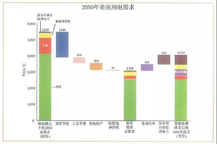 用戶的行為能讓電力部門適合供應的轉(zhuǎn)變。建筑和工業(yè)的最終電力使用效益增幅可減小傳統(tǒng)發(fā)電需求。被廣泛采用的熱電聯(lián)產(chǎn)也可以減小這一需求。電動汽車使用更多的電力,但不多于其他地方節(jié)約的電力。整體使用量下降25%。保守起見,一體化設(shè)計的節(jié)電量井未在圖中體現(xiàn)。