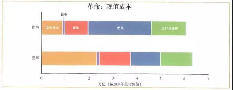 “革命情景”的現(xiàn)值成本(2010年)略高于保持情景。盡管其資金成本具有較高不確定性(取決于待續(xù)的技術(shù)成本降低),并且部分超出成本可被“革命情景”較低的燃料成本所避免的不確定性抵消掉。但是,金融經(jīng)濟學知識正在改變這一狀況。