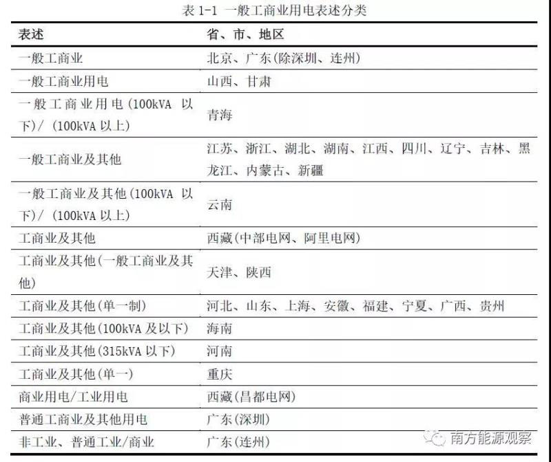 截至2019年1月1日,全國各省市對于一般工商業(yè)用電的表述并不一致,見表1-1。除北京開發(fā)區(qū)、西藏和青海外,大部分省市均按照執(zhí)行單一制用電的用戶進行一般工商業(yè)的認定。