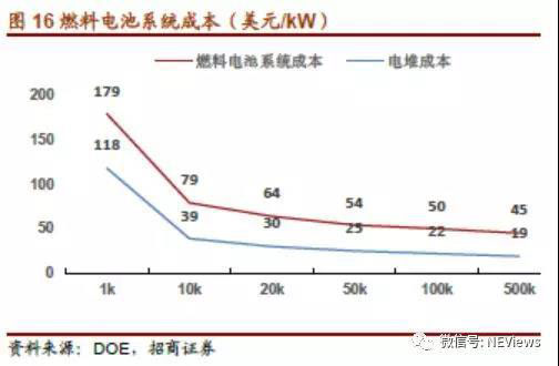 在保證規(guī)模生產的前提下,乘用車燃料電池的成本基本可以達到商業(yè)化水準,隨著未來技術的進步,燃料電池的成本有望進一步下降。