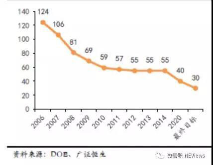 我們再以豐田的Mirai燃料電池為例,根據(jù)測算,Mirai燃料電池系統(tǒng)的成本達到233美元/W,其中73%的成本為電堆成本以114KW功率為標準,1000臺產量下每臺Mirai的燃料電池系統(tǒng)成本為26562美元,2015年Mirai在美售價57500美元,在有補貼政策的情況下,每年銷量為2000多臺。如果產量達到10000臺,燃料電池系統(tǒng)成本將有望下降至9000美元,則基本上可以實現(xiàn)商業(yè)化。