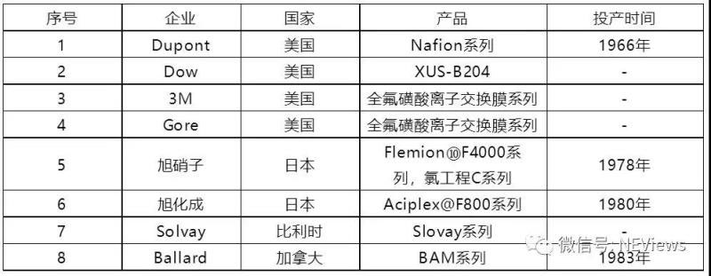 全氟類質子交換膜包括普通全氟化質子交換膜、增強型全氟化質子交換膜、高溫復合質子交換膜。主要生產國家有美國、日本、加拿大、比利時和中國的東岳集團。