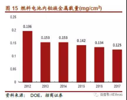 電催化劑的主要作用是促進氫、氧在電極上的氧化還原過程。目前使用的電催化劑主要為鉑碳催化劑,由于鉑是一種貴金屬元素,材料成本占據(jù)主導地位的鉑碳催化劑無法通過量產來降低成本,使得電堆的成本居高不下。因此,未來燃料電池催化劑的研究方向應向低鉑或無鉑催化劑的方向發(fā)展。但是,經(jīng)過多年的發(fā)展,燃料電池電催化劑鉑的擔載量已經(jīng)從2012年的0.196 mg/cm2下降到2017年的0.125mg/cm2,相信未來隨著技術的進步鉑的擔載量將會進一步降低。