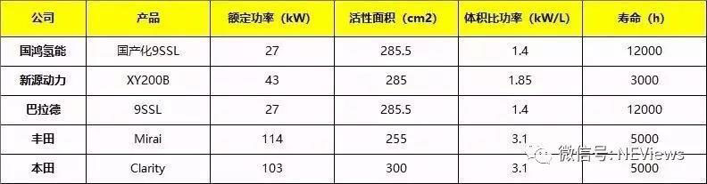 燃料電池乘用車若想能夠商業(yè)化,電堆的壽命至少需要超過5000-10000小時。巴拉德和國鴻氫能的9SSL燃料電池電堆壽命達到了12000小時,可以滿足乘用車對燃料電池壽命的使用要求。但是國產的9SSL電堆使用的是模壓石墨雙極板,這使得電堆的體積功率密度只有1.4KW/L,僅可用于商用車的應用,無法滿足小型乘用車輕量化的需求。豐田的Mirai壽命雖只有5000小時,但是其電堆體積較小,體積功率密度高。下表是國際上幾家主要燃料電池堆生產商的電堆性能對比,從表中可以看出目前燃料電池堆的使用壽命已經(jīng)可以基本滿足商業(yè)化需求,但是在壽命的提高及材料的輕量化上仍然有很長的一段路需要走。
