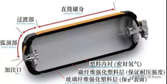 在氫氣的儲存和運輸一塊,目前通用的辦法是通過高壓儲氫罐+拖車的方式進行儲存和運輸,這其中最核心的技術就是儲氫瓶的材料設計。氫瓶主要分為四種類型:全金屬氣瓶(I型)、金屬內膽纖維環(huán)向纏繞氣瓶(II型)、金屬內膽纖維全纏繞氣瓶(III型)及非金屬內膽纖維全纏繞氣瓶(IV型)。國際上大部分燃料電池汽車采用的都是IV型瓶(圖19)。國內目前還沒有IV型高壓氫瓶的相應法規(guī)標準。