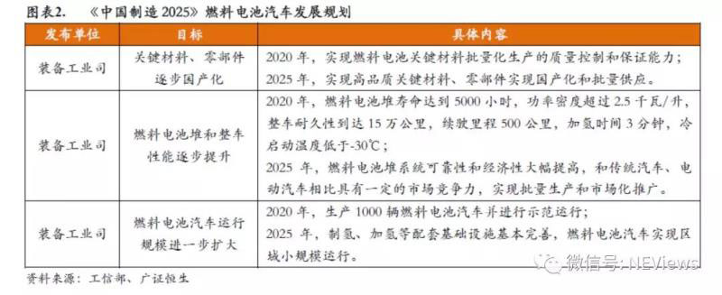 隨著燃料電池產業(yè)發(fā)展逐漸成熟,中國在燃料電池領域的規(guī)劃綱要和政策逐漸清晰,政府從發(fā)展路線、產業(yè)規(guī)劃和補貼扶持全方位支持燃料電池產業(yè)的發(fā)展。2015年我國出臺的《中國制造2025》,關于節(jié)能與新能源汽車產業(yè)發(fā)展的10年戰(zhàn)略目標,指岀我國燃料電池汽車需要在三個關鍵方向實現(xiàn)突破:關鍵材料、零部件逐步國產化;燃料電池堆和整車性能逐步提升;燃料電池汽車運行規(guī)模進一步擴大。2017年4月三部委聯(lián)合印發(fā)《汽車產業(yè)中長期發(fā)展規(guī)劃》,進一步明確了以2020年、2025年、2030年為三個關鍵時間節(jié)點的燃料電池汽車技術發(fā)展路線。