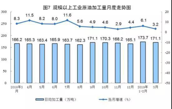3月份,原油加工量同比增長3.2%,增速比1—2月份回落2.9個百分點;日均加工171.1萬噸,比1—2月份日均減少2.6萬噸。1季度,原油加工量15537萬噸,同比增長4.4%,比去年同期回落3.1個百分點。