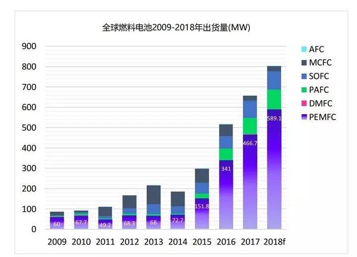 圖2 全球燃料電池2009-2018年出貨量以瓦數(shù)計(jì)(MW)