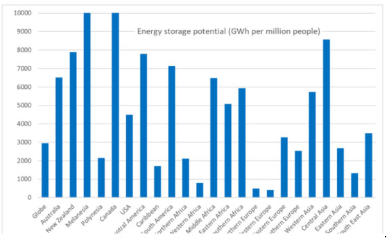 世界各國和地區(qū)的儲能潛力,單位為千兆瓦時(GWh)/百萬人。為發(fā)達經(jīng)濟體提供100%可再生電力所需儲能容量的粗略近似值是20 GWh/百萬人